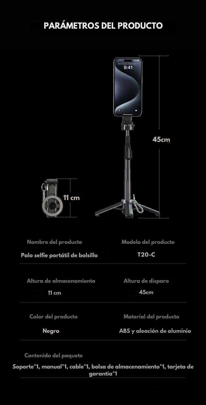 • Función 4 en 1 (mini tripode,soporte, selfie stick y grip)